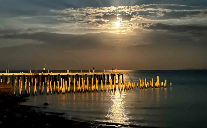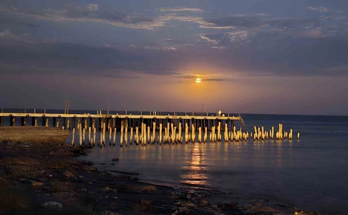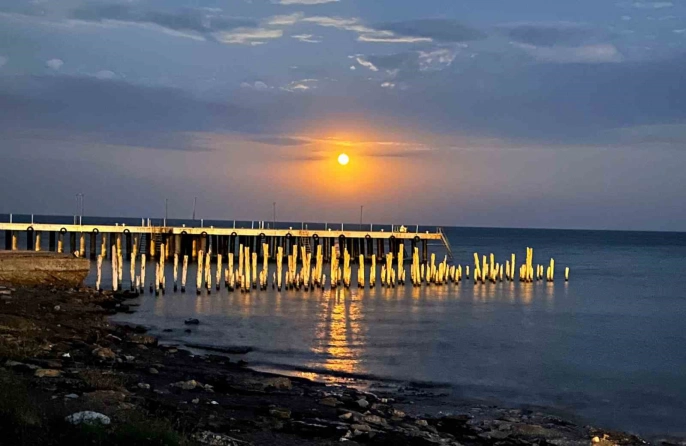 Bitlis'in Ahlat ilçesindeki iskele üzerinde beliren dolunay, Van Gölü'nde muhteşem bir yakamoz oluşturarak izleyenlere görsel bir şölen sundu. Parçalı bulutlu hava nedeniyle dolunay kimi zaman bulutların arasında kaybolurken, kimi zaman da tüm ihtişamıyla gökyüzünde yükseldi.