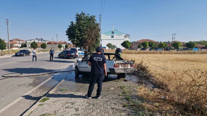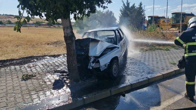 Çorum'un Alaca ilçesinde meydana gelen bir trafik kazasında, 19 AAT 481 plakalı otomobil kaldırıma çıkarak ağaca çarptı ve alev aldı. Kaza, Alaca ilçesi Çorum Caddesi'nde yaşandı.