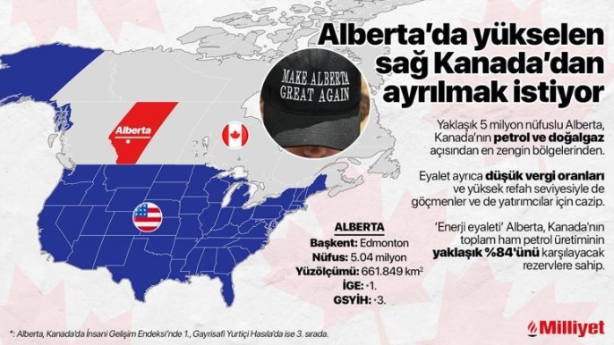 Enerji ve tarım sektöründeki gücüyle tanınan Alberta, yüksek refah seviyesi ve düşük vergi oranlarıyla biliniyor. Kanada'nın ham petrol üretiminin büyük bir kısmını karşılayan eyalette, Başbakan Danielle Smith'in ABD Başkanı Trump ile yakın ilişkiler kurma çabaları da dikkat çekiyor. Smith'in, Trump'ın olası tehditlerine karşı diğer eyalet yöneticileriyle bir araya geldiği de basına yansıdı.
