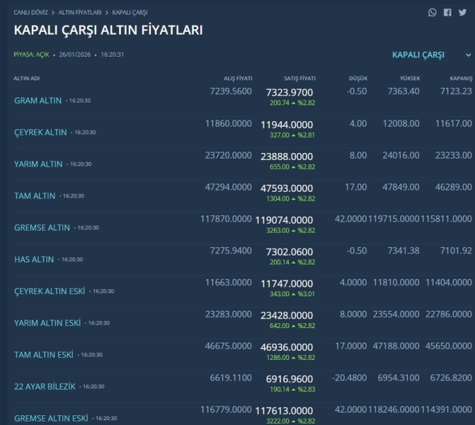 Resmi rakamlarda gram altın 7 bin 127 liraya yükselirken, Kapalıçarşı'da fiyatlar kontrolden çıktı. Gün içinde sık sık değişen tabelalarda gram altın 7 bin 323 liraya kadar tırmandı. Kuyumcular, fiyatları takip etmekte zorlanırken, Kapalıçarşı'da 'tabela mesaisi' uzadı.