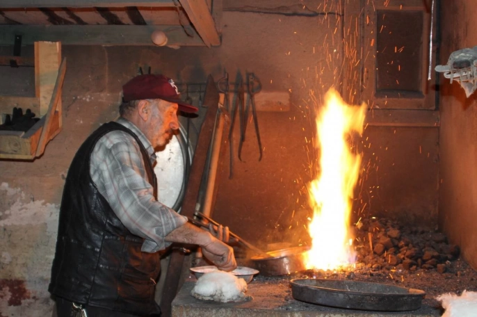 Bayburt’ta 69 yaşındaki Hanefi Sarıkaya, 58 yıldır bakır ve kalay işiyle uğraşıyor. 11 yaşında çırak olarak başladığı mesleğini yarım asırdır sürdüren Sarıkaya, 4 çocuğunu bu meslekle büyüttü.