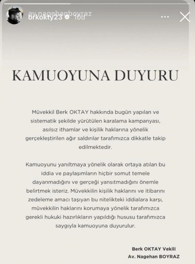 Magazin basınında yer alan iddialarla ilgili olarak Berk Oktay, sosyal medya hesabından yeni bir paylaşım yapmıştı. Oktay'ın avukatı Nagehan Boyraz, haberlerden sonra hukuki hazırlıkların yapıldığını açıklamış ve ünlü oyuncu bu mesajı Instagram hesabından yayınlamıştı.