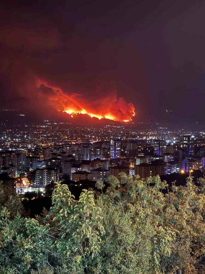 Bursa'nın Kestel ve Gürsu ilçeleri arasındaki ormanlık alanda başlayan yangın, gece saatlerinde rüzgarın etkisiyle hızla yayılıyor. Şehrin gece karanlığı, alevlerin kızıl ışığıyla aydınlandı. Çok sayıda arazöz, itfaiye aracı ve TOMA, karadan yangına müdahale ediyor. Çok sayıda vatandaş ve personel de söndürme çalışmalarına destek veriyor.