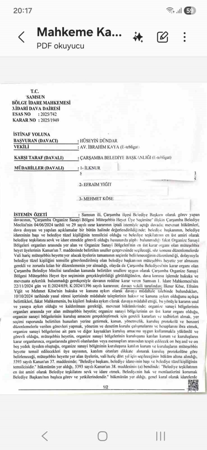 Samsun'un Çarşamba ilçesinde Organize Sanayi Bölgesi (OSB) konusundaki tartışmalar devam ediyor. Çarşamba Belediye Başkanı Hüseyin Dündar'ın, OSB müteşebbis heyeti üyelerinin belirlenmesiyle ilgili belediye meclisinin kararına yaptığı itirazlar, mahkemeler tarafından bir kez daha geri çevrildi.