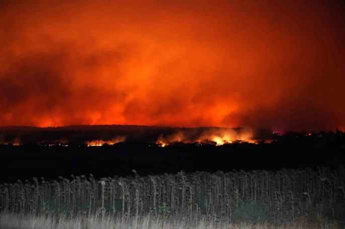 Edirne'nin Enez ilçesine bağlı Büyükevren Köyü'nde çıkan orman yangını, devasa boyutlara ulaşarak yüzlerce vatandaşın tahliyesine neden oldu. Yangın, çevredeki yerleşim yerlerini tehdit ederken, alevler gece karanlığında kilometrelerce uzaktan görülebiliyordu.