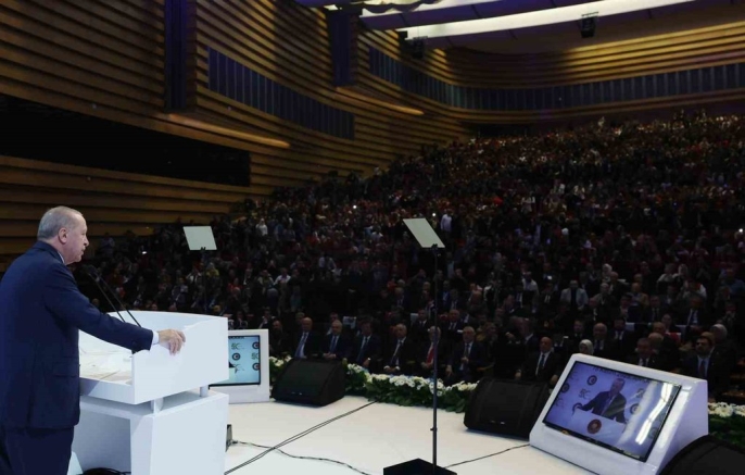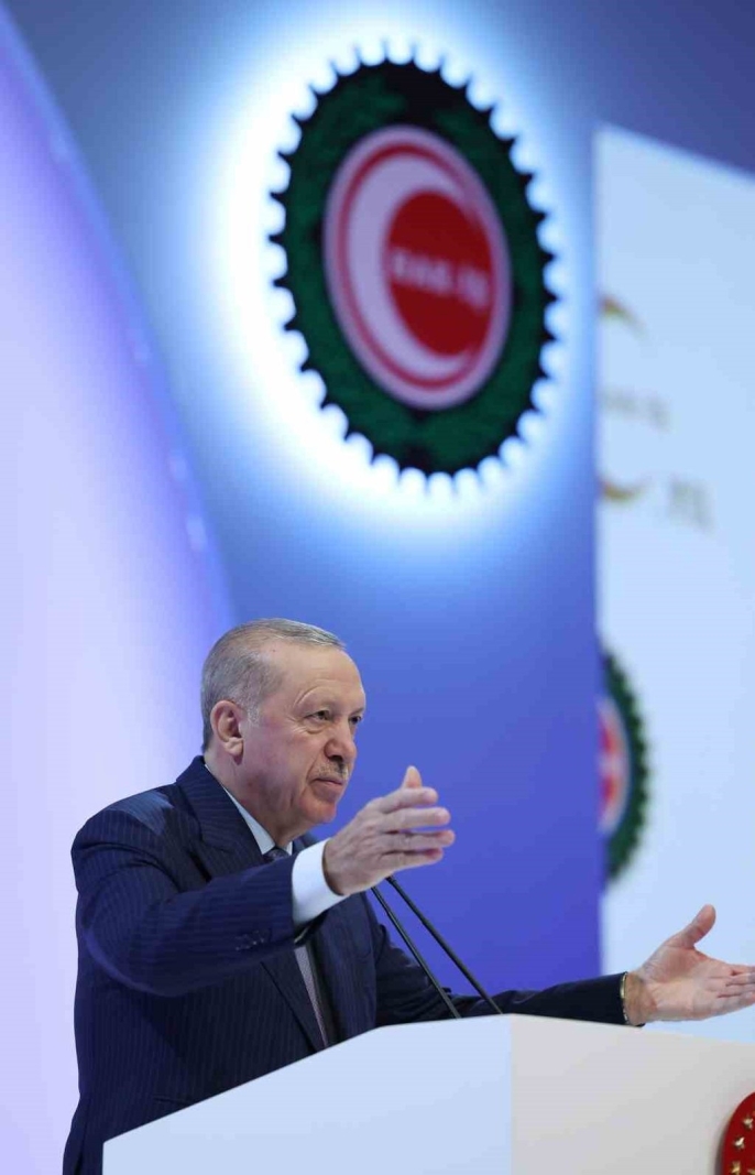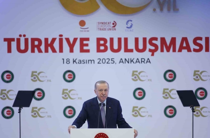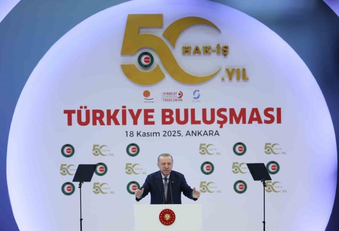 Erdoğan, HAK-İŞ Konfederasyonu'nun 50. yıldönümü dolayısıyla sendikanın emek, demokrasi, özgürlük ve adalet mücadelesini takdir ederek teşekkür etti. 'HAK-İŞ’e ilk günden beri dirayetle sürdürdüğü emek, demokrasi, özgürlük ve adalet mücadelesi için öncelikle teşekkür ediyorum. 50’nci yılın, Hak-İş camiasıyla birlikte sendikalarımız, emekçilerimiz, çalışma hayatımız, ülkemiz ve milletimiz için hayırlı olmasını diliyorum.' ifadelerini kullanan Erdoğan, Türkiye'nin gelişiminde işçilerin katkısını belirterek, 'Şimdiye kadar olduğu gibi, Türkiye Yüzyılında da şeref hakkı, el emeğiyle, göz nuruyla, alın teriyle helal rızkını kazanan siz emekçilerinizin olacaktır. Hükümet olarak bunun için canla, başla çalışmaya devam edeceğiz.' diye ekledi. Cumhurbaşkanı Erdoğan, işçi ve işveren ilişkilerine 'hak temelli' bir bakış açısıyla yaklaşmanın önemini anlattı. 'Bizim medeniyetimizde işçinin, işveren üzerinde hakkı olduğu gibi, işverenin de işçi üzerinde hakkı vardır. Çalışma barışının sağlanması ancak bu şekilde mümkün olacaktır.' dedi ve iş kazalarına dikkat çekerek, 'Evine ekmek götürmek, çocuklarının iaşesini sağlamak, helalinden rızkını kazanmak için ter döken kardeşlerimizin, hepimizi derinden yaralayan bu tür facialarda can vermemesi için hep birlikte daha fazla gayret göstermeliyiz.' şeklinde konuştu. Konuşmasında, hükümetin çalışma hayatına getirdiği yenilikleri, örneğin taşeron işçilerin kadroya geçirilmesi ve 1 Mayıs'ın resmi tatil ilan edilmesini hatırlatan Erdoğan, Türkiye'nin ekonomik başarılarını rakamlarla paylaştı: 'Ekonomide 23 senede yıllık ortalama yüzde 5,4 oranında büyüme kaydettik. 2002’de milli gelirimiz 238 milyar dolardı, biz bunu 2024 yılında 1,5 trilyon dolar sınırına getirdik.' Programa Aile ve Sosyal Hizmetler Bakanı Mahinur Özdemir Göktaş, Çalışma ve Sosyal Güvenlik Bakanı Vedat Işıkhan, HAK-İŞ Genel Başkanı Mahmut Arslan ve çok sayıda sendika üyesi katıldı.
