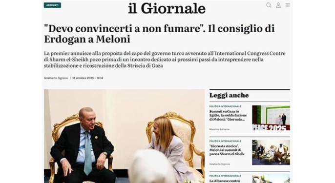 Cumhurbaşkanı Recep Tayyip Erdoğan, Mısır'ın Şarm Eş-Şeyh kentinde düzenlenen Gazze konulu Barış Zirvesi marjında İtalya Başbakanı Giorgia Meloni ile bir araya geldi. Erdoğan'ın görüşme sırasında İtalyan lidere esprili bir dille sigarayı bırakma tavsiyesinde bulunması, İtalyan ve dünya basınında geniş bir şekilde yer aldı.