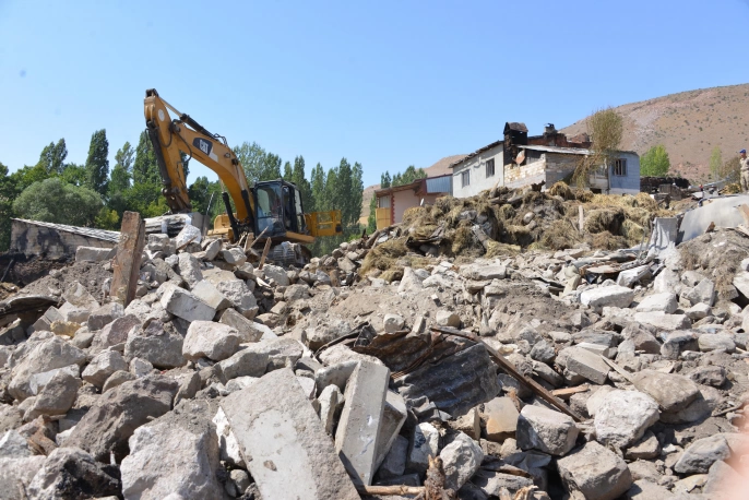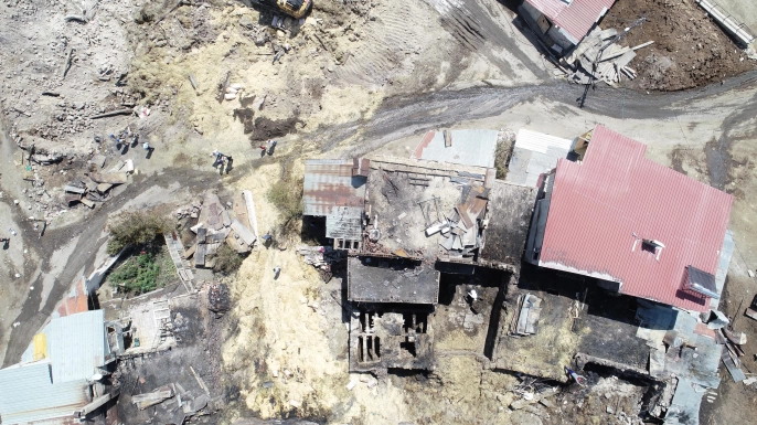 Erzurum'un Yakutiye ilçesine bağlı Kırmızıtaş Mahallesi'nde dün çıkan yangında 10 ev ve 17 ahır tamamen yanarak kül oldu. Yangında 16 büyükbaş hayvan telef olurken, hasar tespit çalışmaları ve temizlik çalışmaları devam ediyor.