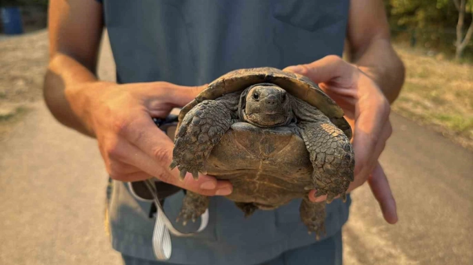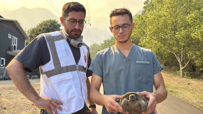 Karaçam ile Nuruosmaniye Mahalleleri arasındaki ormanlık alanda saat 13.00 sıralarında başlayan yangına havadan ve karadan yoğun müdahale sürüyor. Yangından uzaklaşmaya çalışan bir kaplumbağa, veteriner hekimlerin dikkatini çekti. Hızla alevlerin yayıldığı bölgeden koşarak uzaklaşan kaplumbağa, güvenli bir yere alındı. Veteriner hekim, kaplumbağanın yangın bölgesinden koşarak geldiğini ve güvence altına aldıklarını belirterek, 'İlk kontrollerimizde herhangi bir yara izine rastlamadık ancak vücudu çok sıcak. Gerekli kontrollerin ardından Doğa Koruma ve Milli Parklar (DKMP) ekiplerine teslim edeceğiz' dedi.