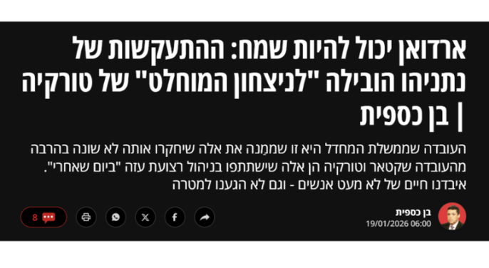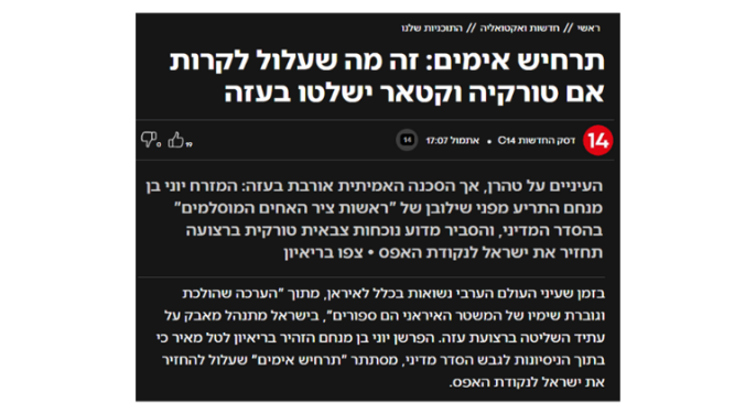 İsrail medyasında konuyla ilgili dikkat çekici yorumlar yapıldı. Channel 14, Gazze'de Türk askeri varlığının İsrail'i 'sıfır noktasına' geri götürebileceği uyarısında bulundu. Analist Ben Menachem, Türkiye ve Katar'ın katılımını 'açıkça olumsuz' olarak değerlendirerek, sürecin İsrail'i başlangıç noktasına döndürebilecek 'korkunç bir senaryo' içerdiğini belirtti. Maariv gazetesi ise, Türkiye'nin bölgesel etkisinin Washington tarafından göz ardı edilemeyeceğini vurguladı. Gazeteci Ben Caspit'in yazısında ise Netanyahu'nun bu konudaki ısrarının Türkiye'nin 'tam zaferine' yol açtığı ve bunun Tel Aviv'de siyasi bir çöküşe işaret ettiği öne sürüldü.