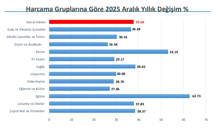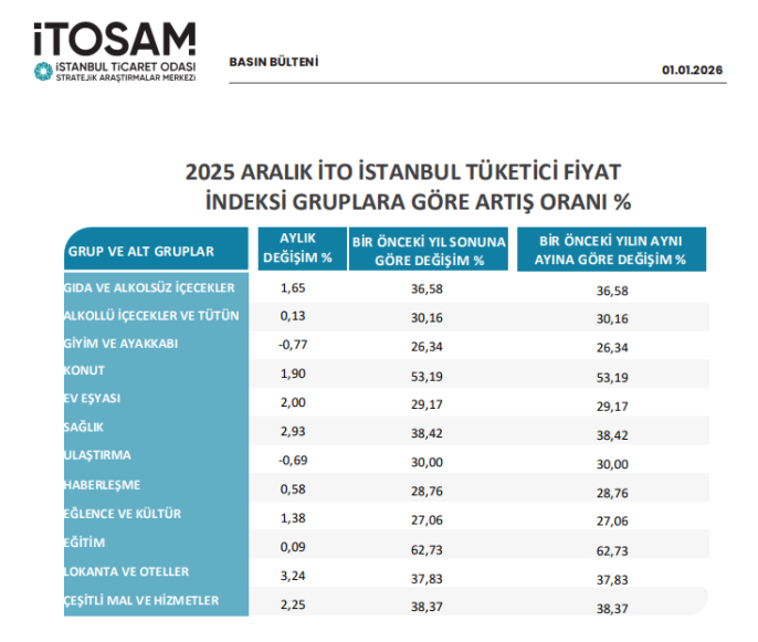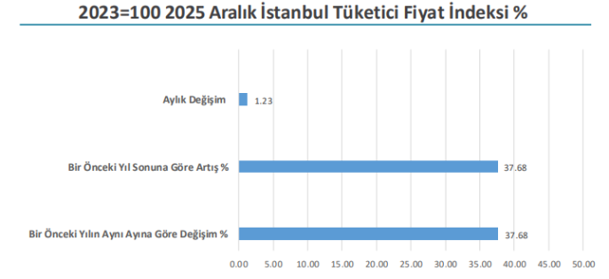 2024 Aralık ayına göre 2025 Aralık ayında İstanbul'da fiyat değişimlerini gösteren İTO İstanbul Tüketici Fiyat İndeksi, bir önceki yılın aynı ayına göre yüzde 37,68 artış gösterdi. Bu durum, özellikle gıda ve konut harcamalarında belirgin bir etkilenme yarattı.