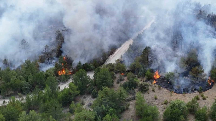 6 helikopter ve 2 yangın söndürme uçağıyla kesintisiz olarak devam eden söndürme çalışmalarına rağmen, alevler rüzgarın etkisiyle Boyalı Köyü Merkez ve Hatlar Mahallesindeki yerleşim alanlarına doğru ilerliyor. Yangının bu bölgelerdeki durumu, dron ile görüntülendi.