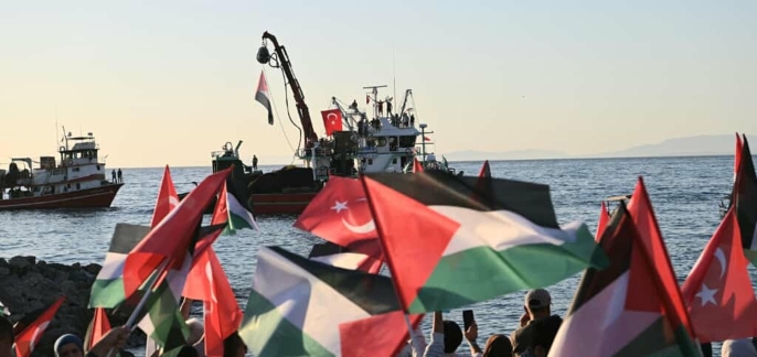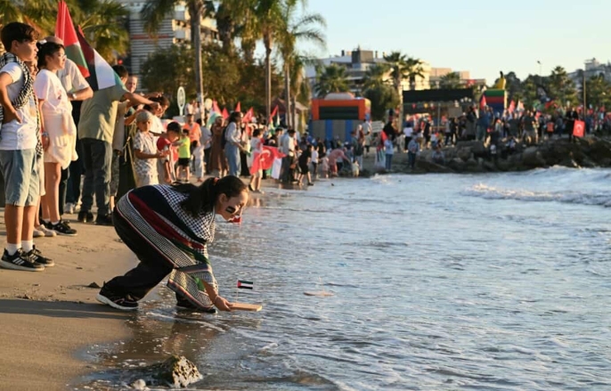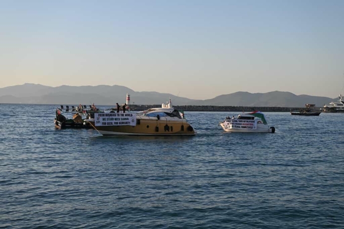 Kuşadası Filistin Platformu öncülüğünde, İsmail Cem Dostluk ve Barış Meydanı'nda bir araya gelen vatandaşlar, 'Filistin yalnız değildir', 'Soykırım bitsin' ve 'Nefes almak yetmiyor yaşamak için' yazılı dövizler taşıdı. Balıkçı tekneleri ve yat sahipleri de desteklerini gösterdi. Meydandaki ekrandan Sumud Filosu'na canlı bağlantı gerçekleştirildi. Etkinliğin sonunda çocuklar, Filistin bayraklı oyuncak tekneleri suya bıraktı.