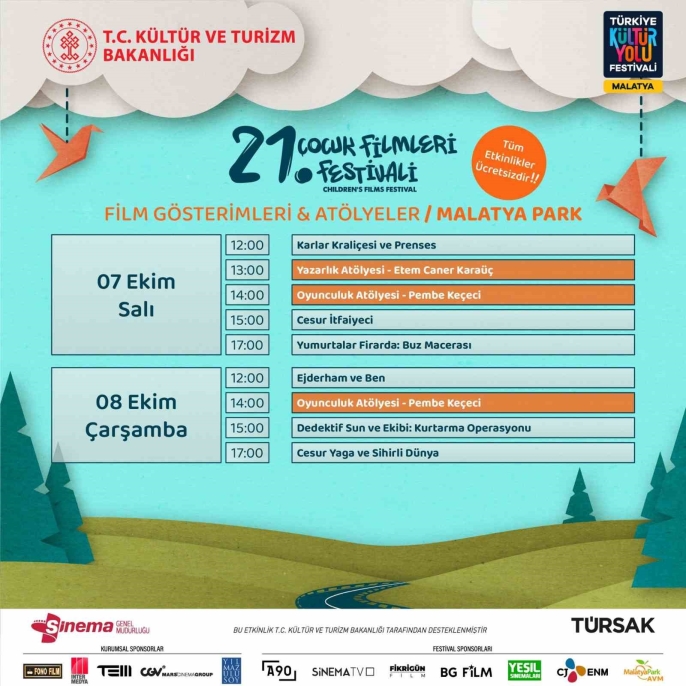 MalatyaPark AVM Yeşil Sinemaları, 4-8 Ekim tarihleri arasında TÜRSAK iş birliğiyle düzenlenecek Çocuk Filmleri Festivali'ne ev sahipliği yapacak. Minik sinemaseverler, ücretsiz gösterilecek birbirinden özel filmlerle keyifli anlar yaşayacak. Festival süresince oyunculuk, yönetmenlik, yazarlık ve sosyal medya içerik üretimi gibi çeşitli alanlarda atölye çalışmaları da gerçekleştirilecek.
