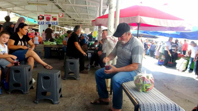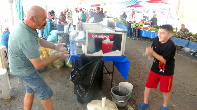 Muğla'da hava sıcaklıklarının mevsim normallerinin üzerinde seyretmesiyle vatandaşlar bunaltıcı sıcaktan kurtulmak için geleneksel bir yönteme başvurdu: kar helvası. Meteoroloji Genel Müdürlüğü'nün uyarılarına göre sıcaklıkların 41 dereceyi bulduğu Muğla'da, özellikle Menteşe ilçesindeki Perşembe Pazarı'nda satılan kar helvası büyük ilgi görüyor.