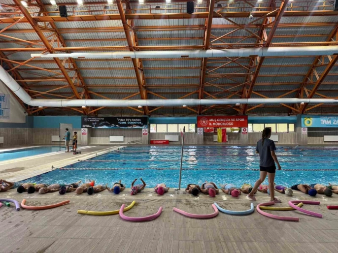 Muş'ta 'Yüzme Bilmeyen Kalmasın' projesi kapsamında yüzme eğitimleri tüm hızıyla sürüyor. Gençlik ve Spor İl Müdürlüğü koordinesinde, yarı olimpik yüzme havuzunda düzenlenen eğitimlerde çocuklar ve gençler, uzman antrenörlerin gözetiminde yüzme tekniklerini öğreniyor.