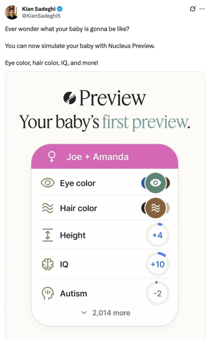 Kısa bir internet araması, detayları meraklı New Yorklulara sundu: Reklamı veren şirket Nucleus Genomics, tüp bebeklerin genetiğiyle oynayarak 'sahip olabileceğin en iyi bebeği' vaat ediyordu. Şirket, müşterilerine 'genetik optimizasyon yazılımı' adını verdiği bir aracına erişim sağlıyor. Bu yazılımın 2000'den fazla genetik yapıyı öngörerek embriyoları analiz etmeyi, karşılaştırmayı ve seçmeyi mümkün kıldığı belirtiliyor.