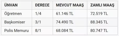 Yapılan zamların ardından ortaya çıkan yeni maaş rakamları dikkat çekici farklılıklar gösterdi. Buna göre, 1/4 derecedeki bir öğretmenin maaşı 61 bin 146 liradan 72 bin 519 liraya yükselirken, aynı derecedeki bir vaizin maaşı 63 bin 916 liradan 75 bin 804 liraya çıktı. Bu durum, öğretmen maaşlarının vaiz maaşlarının gerisinde kalmasıyla ilgili sosyal medyada büyük bir yankı uyandırdı ve pek çok kullanıcı tarafından eleştirildi. Öte yandan, en düşük emekli maaşı da 18 bin 937 liraya yükseldi. Ancak kök maaşı bu seviyenin altında kalan emekliler için bu artışın uygulanabilmesi adına Meclis'te bir yasal düzenleme yapılması gerekliliği de belirtildi.