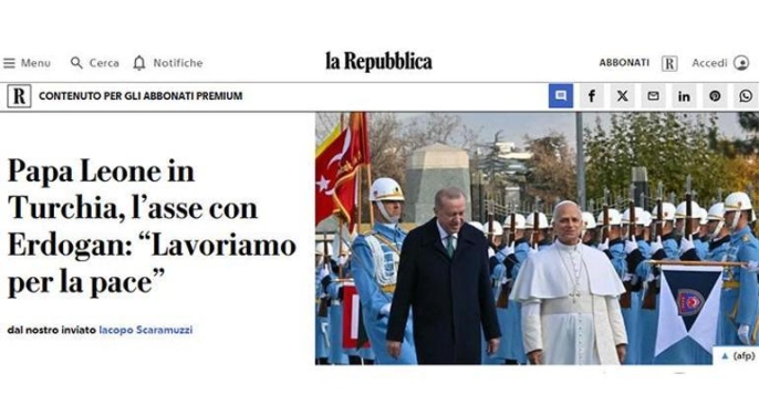 Katoliklerin ruhani lideri ve Vatikan Devlet Başkanı Papa 14. Leo, ilk yurt dışı ziyaretini Türkiye'ye gerçekleştirdi. Ankara'da Cumhurbaşkanı Recep Tayyip Erdoğan ile bir araya gelen Papa'nın bu ziyareti, İtalyan medyasında geniş yankı buldu.