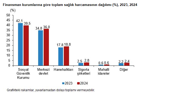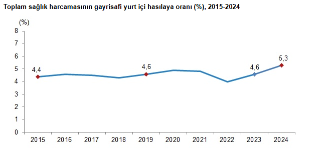 Sağlık harcamalarının Gayri Safi Yurtiçi Hasıla (GSYH) içindeki payı da önemli ölçüde arttı. 2023'te %4,6 olan toplam sağlık harcamasının GSYH'ye oranı, 2024'te %5,3'e yükseldi. Cari sağlık harcamasının GSYH'ye oranı ise %4,2'den %4,9'a çıktı. Bu veriler, sağlığa ayrılan kaynakların genel ekonomik büyüklük içindeki yerinin güçlendiğini gösteriyor. Sağlık hizmeti sunucularına göre en büyük payı %54,6 ile hastaneler alırken, bunu %19,6 ile perakende satış ve tıbbi malzeme sunanlar, %11,0 ile ayakta bakım sunanlar takip etti. Hanehalklarının kendi ceplerinden yaptığı sağlık harcaması ise %100,2 artarak 442 milyar 356 milyon liraya ulaştı ve toplam sağlık harcamasının %18,8'ini oluşturdu.
