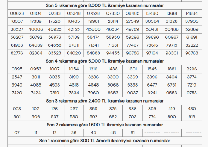 Büyük ikramiye olan 800 milyon Türk Lirası, ilk çekilişte sahibini bulamadı. İkinci çekilişte ise 3, 0, 3, 1, 3, 8, 5 rakamlarına sahip üç ayrı çeyrek bilete isabet etti. Bu şanslı biletler, İstanbul'un Esenyurt ve Ümraniye ilçelerinden ve Konya'nın Akşehir ilçesinden alınmış. İkramiye, üç talihli arasında eşit olarak bölünecek.