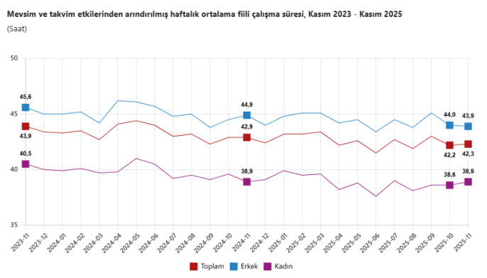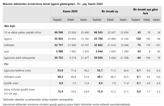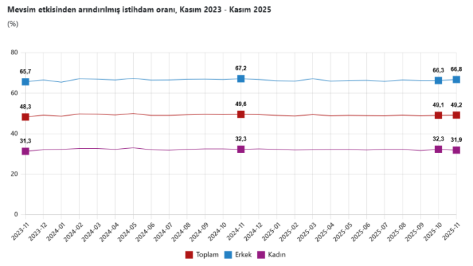 Kasım ayında istihdam edilenlerin sayısı 75 bin kişi artarak 32 milyon 737 bin kişiye ulaştı ve istihdam oranı yüzde 49,2 oldu. İşgücüne katılma oranı ise 0,1 puan artışla yüzde 53,8 seviyesinde gerçekleşti. Ancak bu artışlar, işsizlikteki yükselişi dengelemekte yetersiz kaldı. Ortalama haftalık fiili çalışma süresi ise 42,3 saat olarak kaydedildi.