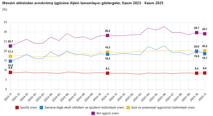 Raporda dikkat çeken bir diğer nokta ise atıl işgücü oranındaki düşüş oldu. Zamana bağlı eksik istihdam, potansiyel işgücü ve işsizlerden oluşan atıl işgücü oranı, bir önceki aya göre 0,6 puan azalarak yüzde 29,1 seviyesine geriledi. Bu düşüş, işgücü piyasasındaki bazı olumlu gelişmelere işaret etse de, genel tablo işsizlik sorununun devam ettiğini gösteriyor.