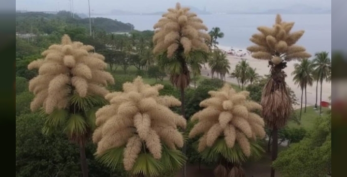 Brezilya'nın Rio de Janeiro kentinde, Flamengo Parkı'nda 1960'larda ünlü peyzaj mimarı Roberto Burle Marx tarafından dikilen talipot palmiyeleri, yıllar süren sessiz büyümenin ardından milyonlarca çiçeği aynı anda açarak görsel bir şölen sunuyor. Kent sakinleri ve botanik meraklıları, bir daha tanık olmaları mümkün olmayan bu çiçeklenmeyi izlemek için parka akın ediyor.