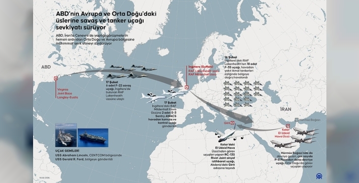 Açık kaynaklardan elde edilen bilgilere göre, son günlerde Orta Doğu'ya gönderilen savaş uçakları, 2025 Haziran'da İran'a yönelik saldırılarda kullanılanlarla benzerlik gösteriyor. Virginia'daki Joint Base Langley-Eustis'ten 6 adet F-22 tipi savaş uçağının, dün itibarıyla İngiltere'deki RAF Lakenheath üssüne ulaştığı bildirildi. Katar'daki El Udeid Hava Üssü'nden görev yapan bir RC-135 Rivet Joint sinyal istihbarat uçağı da Akdeniz'deki Girit adasına taşındı. Hürmüz Boğazı'nda da çok sayıda P-8 Poseidon deniz devriye uçağının devriye yaptığı gözlemlendi.
