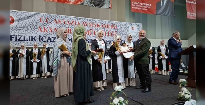 Sakarya'nın Akyazı ilçesinde gerçekleştirilen icazet merasiminde, 27 öğrenci hafızlık eğitiminin sonuna gelerek belgelerini almanın mutluluğunu yaşadı.