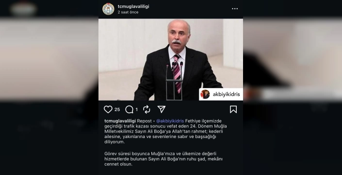 Vali Akbıyık mesajında şu ifadelere yer verdi: 'Fethiye ilçemizde geçirdiği trafik kazası sonucu vefat eden 24. Dönem Muğla Milletvekilimiz Sayın Ali Boğa’ya Allah’tan rahmet, kederli ailesine, yakınlarına ve sevenlerine sabır ve başsağlığı diliyorum. Görev süresi boyunca Muğla’mıza ve ülkemize değerli hizmetlerde bulunan Sayın Ali Boğa’nın ruhu şad, mekânı cennet olsun.'
