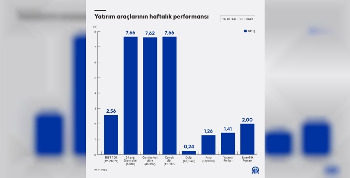Geçen hafta sonu 10 bin 716 lira olan çeyrek altının satış fiyatı, bu hafta yüzde 7,66 artışla 11 bin 537 liraya ulaştı. Ayrıca, ABD doları yüzde 0,24 artarak 43,3540 lira, avro ise yüzde 1,26 yükselerek 50,9070 lira oldu. Yatırım fonları bu hafta yüzde 1,41, emeklilik fonları ise yüzde 2,00 değer kazandı. Yatırım fonları arasında en çok kazandıranlar ise yüzde 5,36 ile 'Kıymetli Maden' fonları oldu.