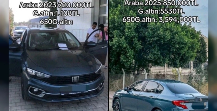 Sosyal medyada paylaşılan bir hesaplamaya göre, 2023 yılında 720 bin TL'ye otomobil alan bir kişi, o günkü gram altın fiyatı olan 1108 TL ile 650 gram altın alabiliyordu. Bugün 650 gram altının değeri 3.6 milyon TL'ye ulaşırken, aynı otomobilin güncel fiyatı 850 bin TL olarak görünüyor. Başka bir vatandaş ise 2023'te 750 bin TL'ye aldığı aracının, o günkü kurla 664 gram altına denk geldiğini belirtiyor. 2026'da aracının satış fiyatının 1 milyon TL olacağını ancak 664 gram altının değerinin 4.423.000 TL'ye ulaştığını ifade ediyor. Hatta bir kullanıcı, 2017'de 128 bin TL'ye aldığı aracının bedelinin o dönem 1300 gram altına karşılık geldiğini, aynı aracın 2026 fiyatının 2.2 milyon TL olduğunu ancak 1300 gram altının değerinin bugün yaklaşık 8.5 milyon TL'ye ulaştığını paylaşıyor.