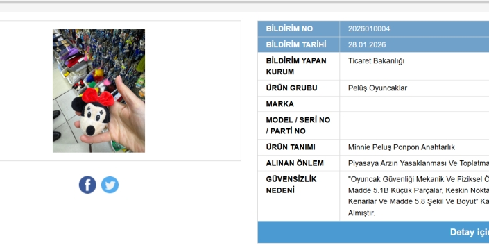 Piyasa gözetimi ve denetimi yetkisine sahip kurumlar tarafından yapılan çalışmalarla güvensiz olduğu belirlenen ürün, Güvensiz Ürün Bilgi Sistemi üzerinden kamuoyuna duyuruldu. İncelemeler, söz konusu oyuncak-aksesuarın mevcut mevzuata aykırı olduğunu ve güvenli kullanım standartlarını karşılamadığını ortaya koydu.