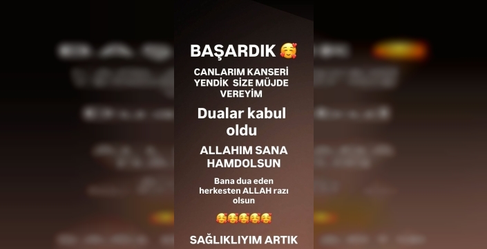 Ünlü sanatçı, uzun bir süredir mücadele ettiği lösemi kanserini yendiğini açıkladı. Sosyal medya üzerinden yaptığı paylaşımda, "Başardık canlarım... Kanseri yendik, size müjde vereyim. Dualar kabul oldu. Allah'ım sana hamdolsun. Bana dua eden herkesten Allah razı olsun. Sağlıklıyım artık" ifadelerine yer verdi.