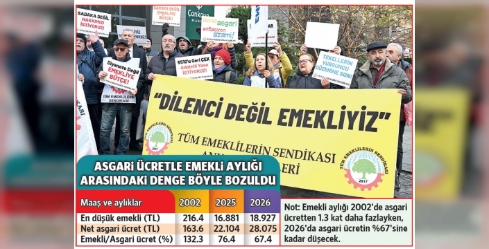 Yüzde 27’lik zam kesinleştiği için asgari ücret 1 Ocak 2026’dan itibaren 28 bin 75 lira olacak. Emeklinin kasım sonu itibarıyla 5 aylık zammı yüzde 11.2 olarak belirlendi. 2026’nın ilk 6 ayı için yapılacak zam oranı ise 3 Ocak 2026’da netleşecek. Olağanüstü bir durum yaşanmazsa emeklinin alabileceği zam, yüzde 12.1-12.5 arasında kalacak. Bu durumda en düşük emekli aylığı yeni yılda 18 bin 827 lira ile 18 bin 991 lira arasında olacak. Asgari ücretle emekli aylığı arasındaki fark 9 bin 151 liraya kadar yükselebilir. Memur emeklilerine yeni yılda yüzde 11 toplu sözleşme zammı ile enflasyon farkı dahil, seyyanen zam hariç yüzde 18.5 zam yapılması bekleniyor. AKP’nin iktidara geldiği 2002 yılında emekli aylığı 216.4 lira, asgari ücret ise 163.6 lira idi. Yani en düşük emekli aylığı asgari ücretten yüzde 32.3 daha fazlaydı. Ancak 2026 yılı itibarıyla en düşük emekli aylığı 18 bin 927 lira, asgari ücret ise 28 bin 75 lira olacak. Bu durumda en düşük emekli aylığı, asgari ücretin yüzde 67.4’üne kadar düşmüş olacak.