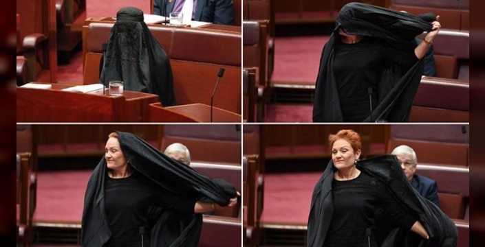 Avustralya basınında yer alan haberlere göre, Senatör Pauline Hanson, burka ve yüzü tamamen kapatan kıyafetlerin yasaklanması için yasa tasarısı sunma izni verilmemesine tepki göstermek amacıyla burka giyerek meclise geldi.