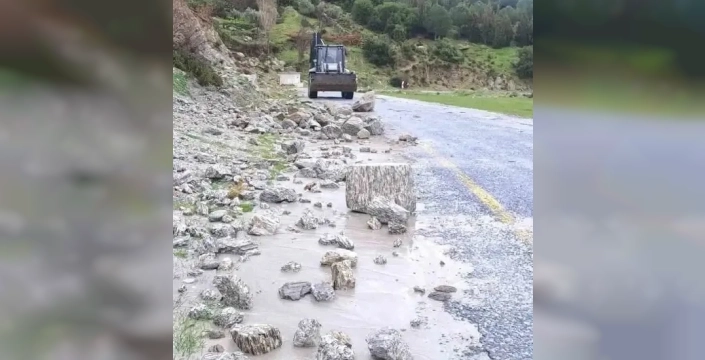 Aydın’ın Koçarlı ilçesinde etkili olan yağışlar sonucunda meydana gelen toprak kayması, düşen kaya parçaları nedeniyle yolu kapattı.