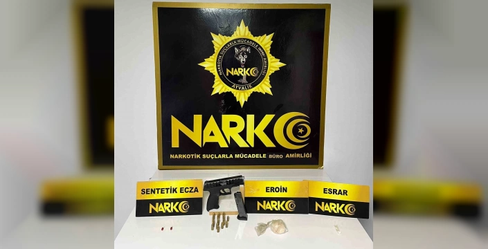 Ayvalık İlçe Emniyet Müdürlüğüne bağlı Ayvalık Narkotik Suçlarla Mücadele Büro Amirliği ekipleri, yaptıkları operasyonda bir araçta ve şahısların üzerinde 18.05 gram eroin, 2 adet sentetik ecza maddesi, 0,49 gram esrar, 1 adet 9 mm çapında ruhsatsız tabanca, tabancanın şarjörü içinde 7 adet 9 mm çapında mermi, 8 adet 9 mm çapında ve 1 adet 7.65 mm çapında fişek buldu.