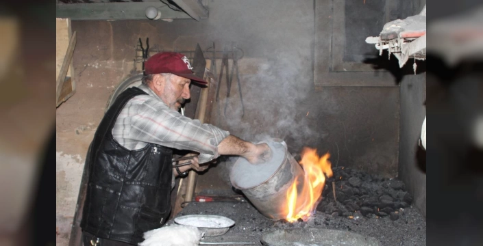 Bayburt'ta 69 yaşındaki Hanefi Sarıkaya, 11 yaşında çırak olarak başladığı bakır ve kalay işçiliğini 58 yıldır sürdürüyor. 4 çocuğunu bu meslekle büyüten Sarıkaya, yarım asırdır bakırı parlatarak geçimini sağlıyor ve mesleğini ömrü yettiğince yaşatmaya devam edeceğini belirtiyor.