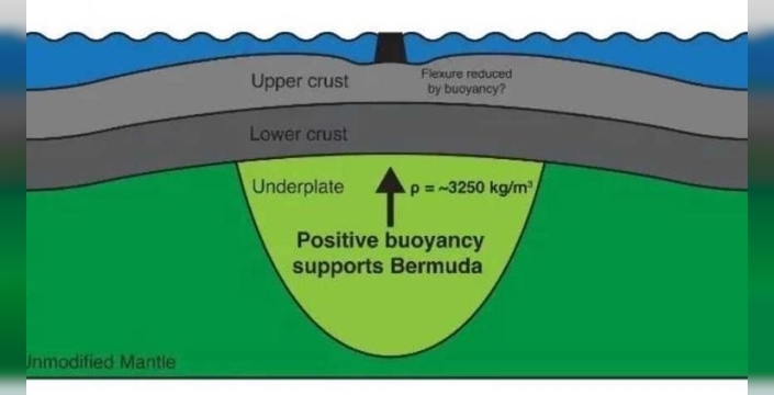 Normalde, volkanik faaliyetlerin sona ermesiyle tektonik levhanın mantodaki sıcak noktadan uzaklaşması ve soğuyan kabuk ile volkanın zamanla çökmesi beklenir. Ancak Bermuda'nın altında bu süreci tersine çeviren istisnai bir jeolojik yapı tespit edildi. Geophysical Research Letters dergisinde yayınlanan yeni bir araştırmaya göre, Bermuda'nın altındaki okyanus kabuğunun hemen altında yaklaşık 20 kilometre kalınlığında, dünya genelinde benzeri görülmemiş bir kaya katmanı bulunuyor. Bu kalın kaya katmanının, adayı milyonlarca yıldır ayakta tutan ana etken olduğu düşünülüyor.