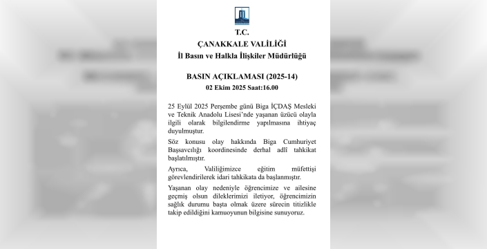 25 Eylül'de Biga İÇDAŞ Mesleki ve Teknik Anadolu Lisesi'nde yaşanan olayda, M.D.Y. isimli öğrenci, sınıf arkadaşı Y.C.'nin ayağına bastı. Bu basit temasın ardından Y.C.'nin saldırgan tavırları M.D.Y.'nin başını sıraya çarpmasına ve yere düşmesine neden oldu. Yerdeki öğrenciye tekmeler ve yumruklarla saldırmaya devam eden Y.C. sonrası M.D.Y. fenalaştı. Acil müdahale ile kalbi çalıştırılan öğrenci, hastaneye sevk edildi.