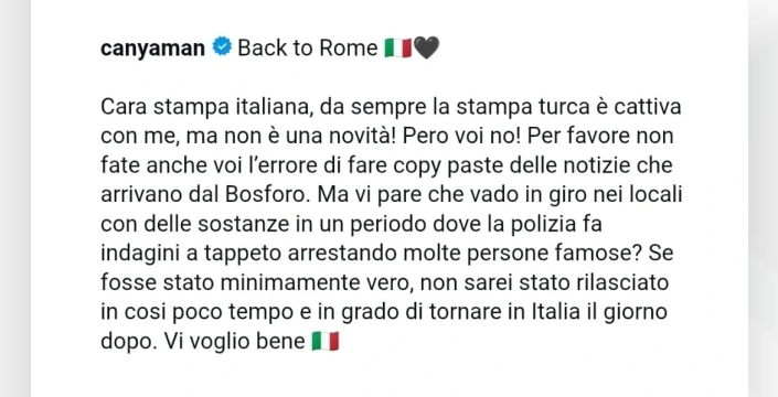 Can Yaman, açıklamasında İtalyan basınına seslenerek, "Sevgili İtalyan basını, her zamanki gibi Türk basının saldırması kesinlikle yeni bir şey değil! Ama siz de… Lütfen Boğaz’dan gelen haberleri kopyalarken yaptığınız hatayı da yapmayın. Polisin birçok ünlüyü tutukladığı bir zamanda uyuşturucuyla dolaştığımı mı düşünüyorsunuz?" ifadelerini kullandı.