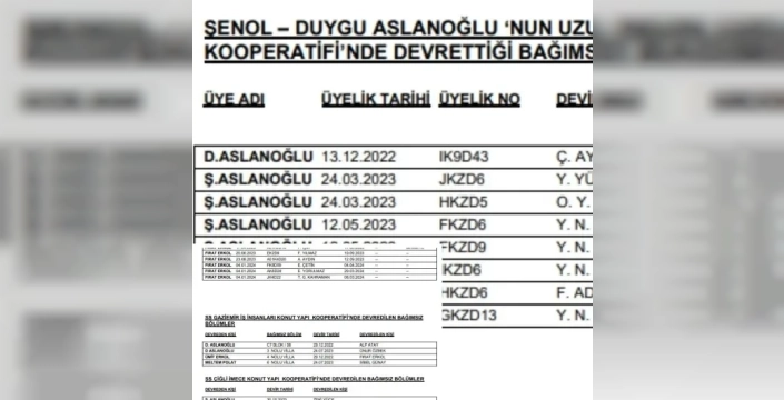 Uzundere Kooperatifi'ne ait kayıtlarda, Şenol Aslanoğlu, Duygu Aslanoğlu, CHP Ankara İl Başkanı Ümit Erkol ve Fırat Erkol adına kayıtlı üyeliklerin, alındığı gün veya çok kısa bir süre içinde üçüncü şahıslara devredildiği belirtiliyor. Belgelerde yer alan bilgilere göre, ödeme tutarlarının da dosyada kalem kalem gösterildiği ifade ediliyor. Gaziemir İş İnsanları Konut Yapı Kooperatifi'nde ise C-7 Blok'ta bulunan bir daire ve villaların farklı isimlere devredildiği, Çiğli İmece Konut Yapı Kooperatifi'nde ise aynı gün içinde birden fazla kişiye yapılan devirlerin kayıtlara geçtiği iddia ediliyor.