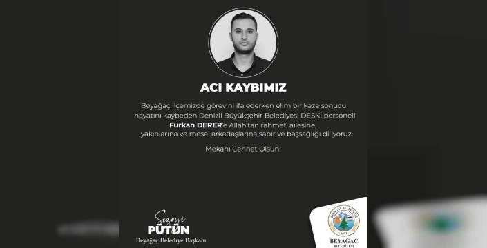 Beyağaç Belediye Başkanı Sezayi Pütün, hayatını kaybeden DESKİ personeli için taziye mesajı yayımladı. Başkan Pütün, mesajında, 'Beyağaç ilçemizde görevini ifa ederken elim bir olay sonucu hayatını kaybeden Denizli Büyükşehir Belediyesi DESKİ personeli Furkan Derer’e Allah’tan rahmet; ailesine, yakınlarına ve mesai arkadaşlarına sabır ve başsağlığı diliyoruz. Mekanı cennet olsun' ifadelerini kullandı.