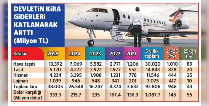 2025 yılında, özel şirketlerden 'hizmet binası' olarak kiralanan lüks gökdelenler ve çeşitli binalar için de 4 milyar 234 milyon lira kira ödemesi yapıldı. 2021 ile 2025 yılları arasındaki toplam kira harcaması ise tam 93 milyar lirayı aştı. Ayrıca, 2025'te kiralananların yanı sıra 3 milyar 346 milyon liralık hava taşıtı satın alımı da gerçekleşti. 2024 yılındaki 4 milyar 49 milyon liralık alımla birlikte, son 2 yılda satın alınan taşıtlara aktarılan para 7 milyar 395 milyon liraya ulaştı.