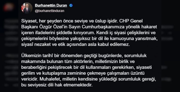 İletişim Başkanı Burhanettin Duran, CHP Genel Başkanı Özgür Özel'in Cumhurbaşkanı Erdoğan'a yönelik sözlerini sert bir dille kınadı. Duran, sosyal medya hesabından yaptığı açıklamada, siyasetin seviye ve üslup gerektirdiğini vurguladı.