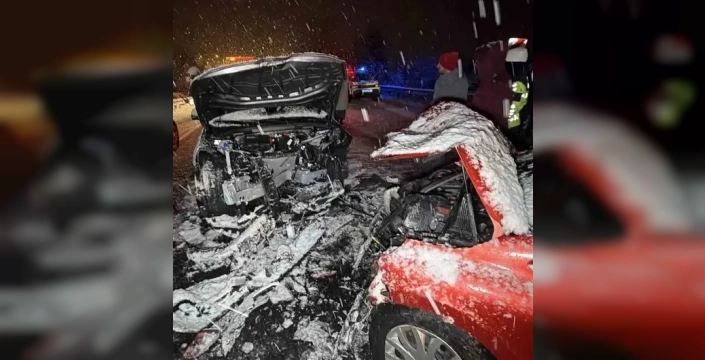 Düzce’de yoğun kar yağışı etkili olurken, Gölyaka bağlantı yolunda kayganlaşan yolda iki araç kafa kafaya çarpıştı.