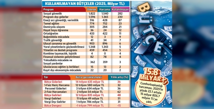 Sosyal güvenlik için ayrılan 1 trilyon 822 milyar TL'nin 282 milyar TL'si kullanılmadı. Bu kaynaklar, emeklilerin aylığına ve ihtiyaçlarına gitmedi. Enerji, eğitim ve yoksullukla mücadele gibi alanlarda da benzer bir tablo var; harcama yapılmıyor ama gelir rekor seviyelere ulaşıyor. Resmi verilere göre, aralıkta merkezi bütçe 528 milyar TL açık verdi. Yıl genelinde bütçe açığı ise 1.8 trilyon TL'yi buldu. CHP Genel Başkanı Özgür Özel, bütçede kaynak olmadığı yönündeki söylemlere rakamlarla cevap verdi.