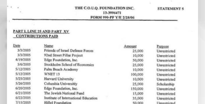 2005 yılına ait Epstein'in vergi beyanlarının incelenmesiyle elde edilen bilgiler, 'İsrail Savunma Kuvvetleri Dostları' adlı kuruluşa 25 bin dolarlık bir bağış yapıldığını net bir şekilde gösteriyor. Bunun yanı sıra, Batı Şeria'daki yasa dışı Yahudi yerleşim birimlerine finansal destek sağladığı bilinen 'Yahudi Ulusal Fonu'na 15 bin dolar ve Yahudi Kadınlar Ulusal Konseyi'ne de 5 bin dolar gönderildiği belgelerde ayrıntılı bir şekilde yer alıyor.